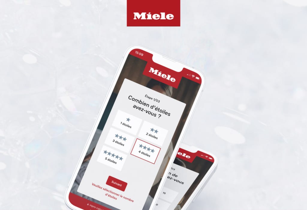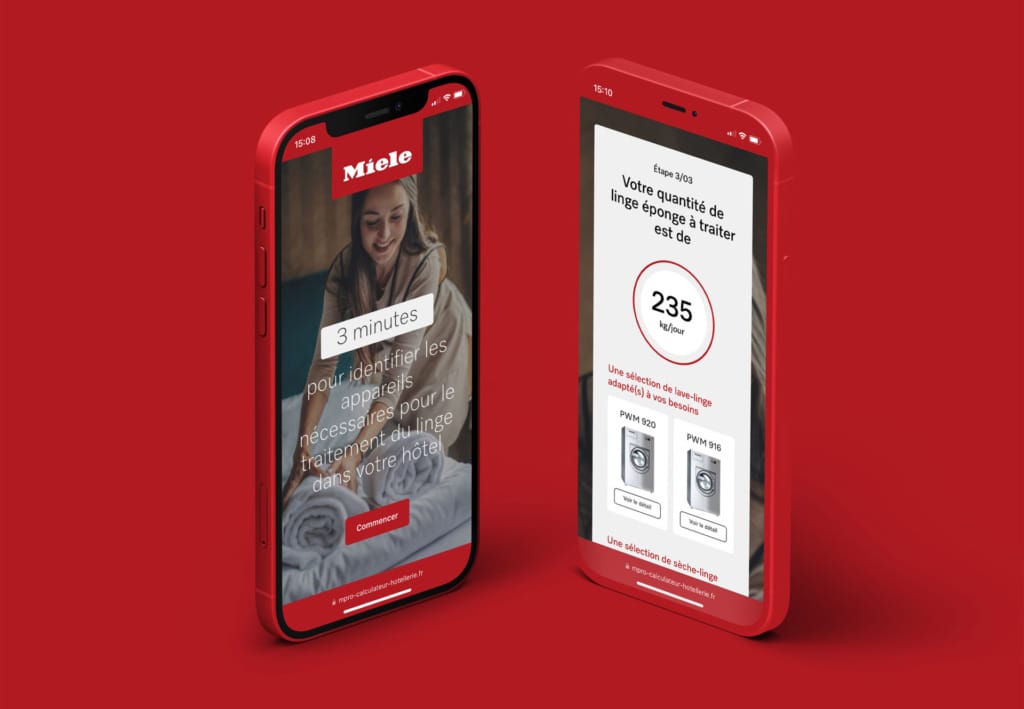 La web App proposĂ©e par l’agence permet de rĂ©pondre pleinement aux attentes Ă la fois de la cible finale et Ă©galement de la force de vente. On sĂ©lectionne successivement plusieurs critères comme le nombre d’Ă©toiles, de chambres, etc pour obtenir la quantitĂ© de linge Ă traiter par jour et des recommandations sur les produits les plus adaptĂ©s de la gamme Miele Professional.