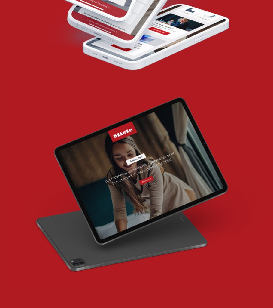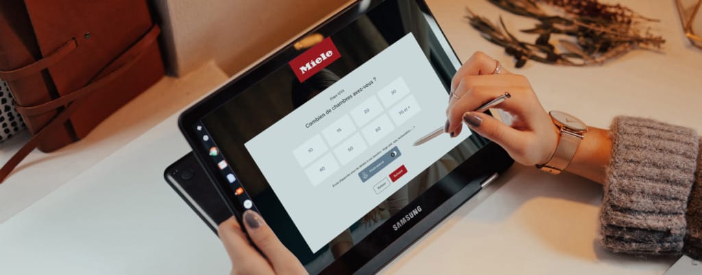 Conception, crĂ©ation et dĂ©veloppement, l’Ă©quipe a travaillĂ© dans un souci de simplicitĂ© et de rapiditĂ© d’accès. Le dĂ©fi reposait sur la rĂ©alisation d’un support lors de rendez-vous commerciaux qui alimente la dialogue sans le couper et qui valorise l’accompagnement des Ă©quipes MIELE. Une solution concrète d’aide Ă la vente.