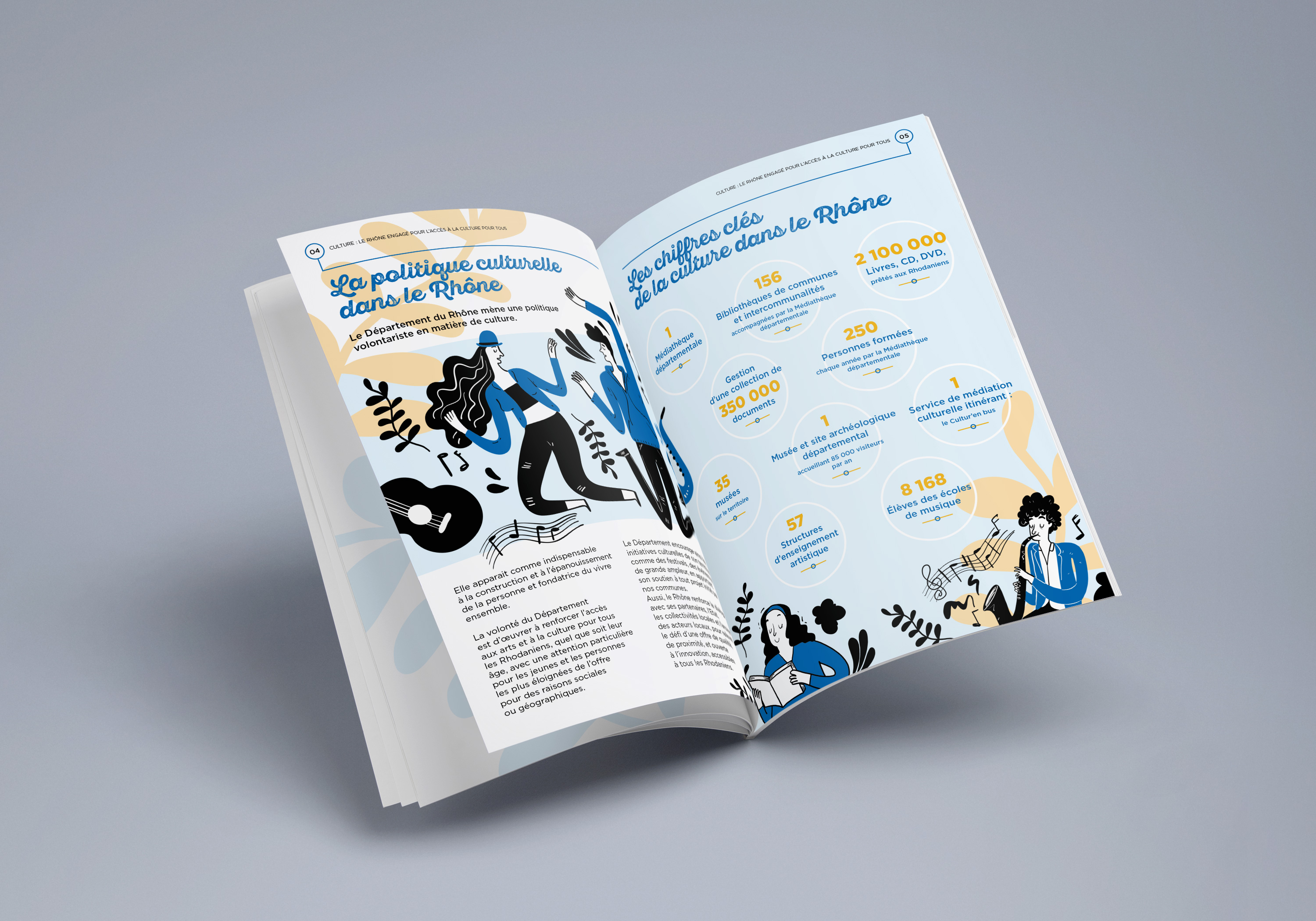 Résultat : une plaquette ludique de 12 pages valorisant la politique culturelle du Rhône ainsi que la richesse du territoire (Musée Gallo-Romain de Saint-Romain-en-Gal, La Médiatèque départementale & Les Archives départementales et métropolitaines).